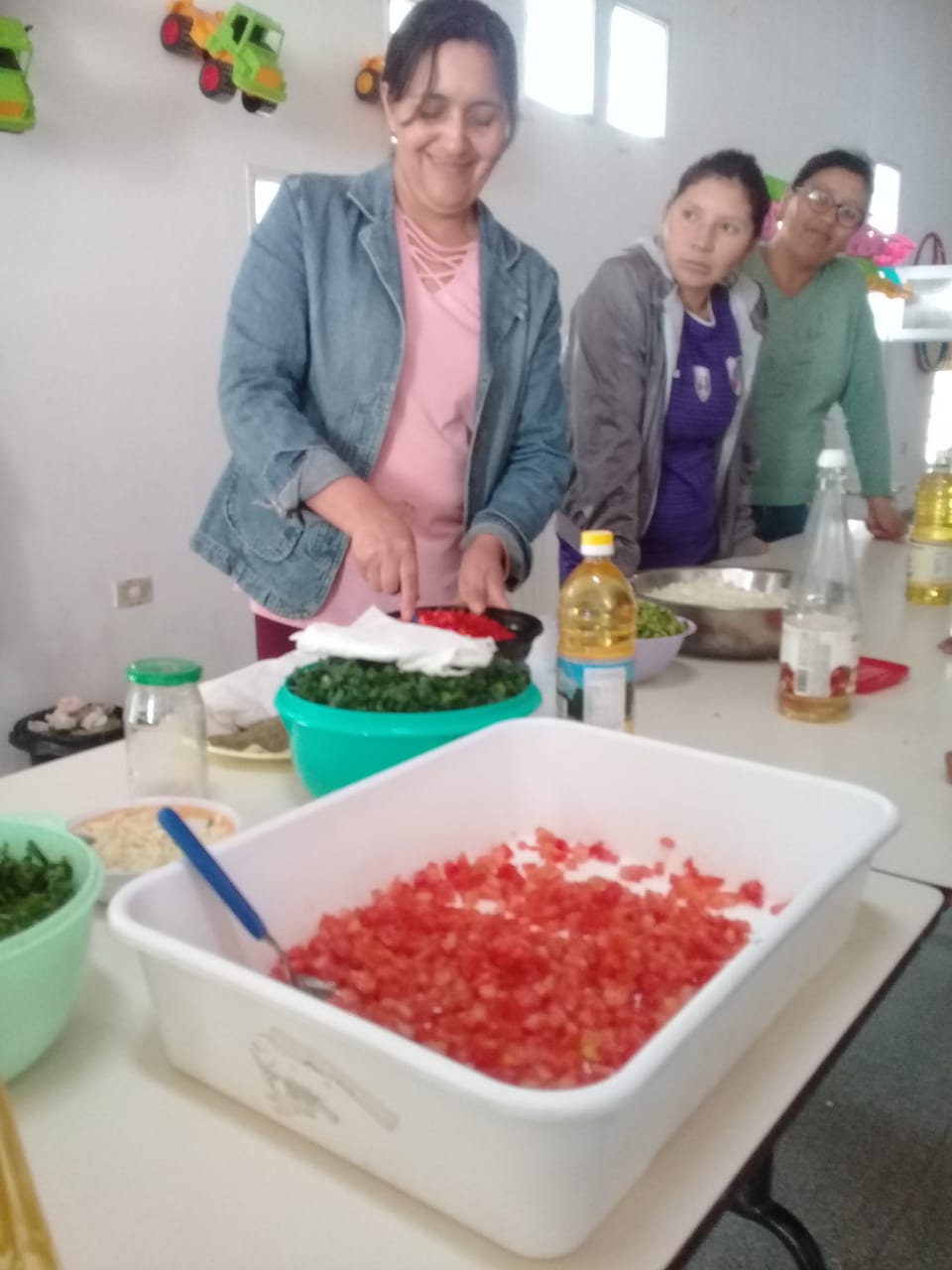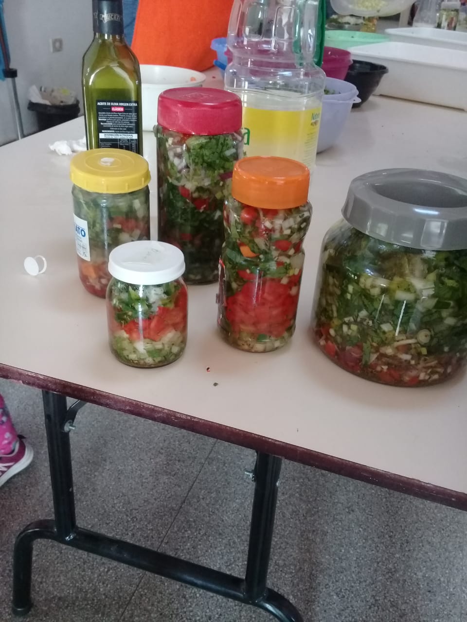 En el taller de cocina se realizaron salsas criollas a pedido de lxs participantes, entre todxs colaboraron con las verduras que tenían en sus quintas y se llevaron una rica salsa enfrascada para condimentar las carnes. Pero también hubo producción dulce, riquísimas pasta frolas y galletitas prepararon las mamás y los papás para una sorpresa que se viene más adelante…