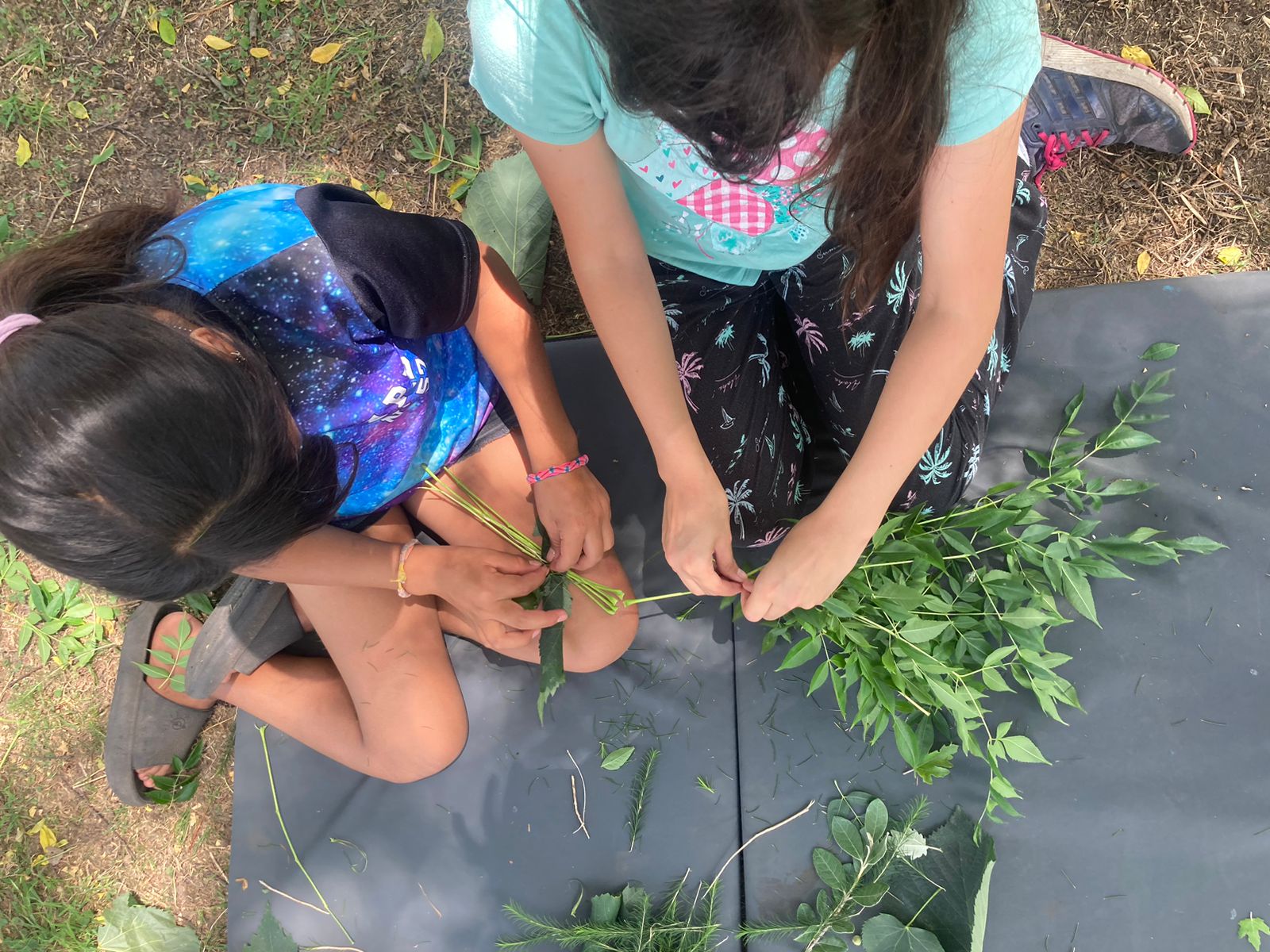 Construimos canastitas y ramos de flores con hojas de nuestros hermosos árboles. No solo podemos ser artistas, también artesanos.